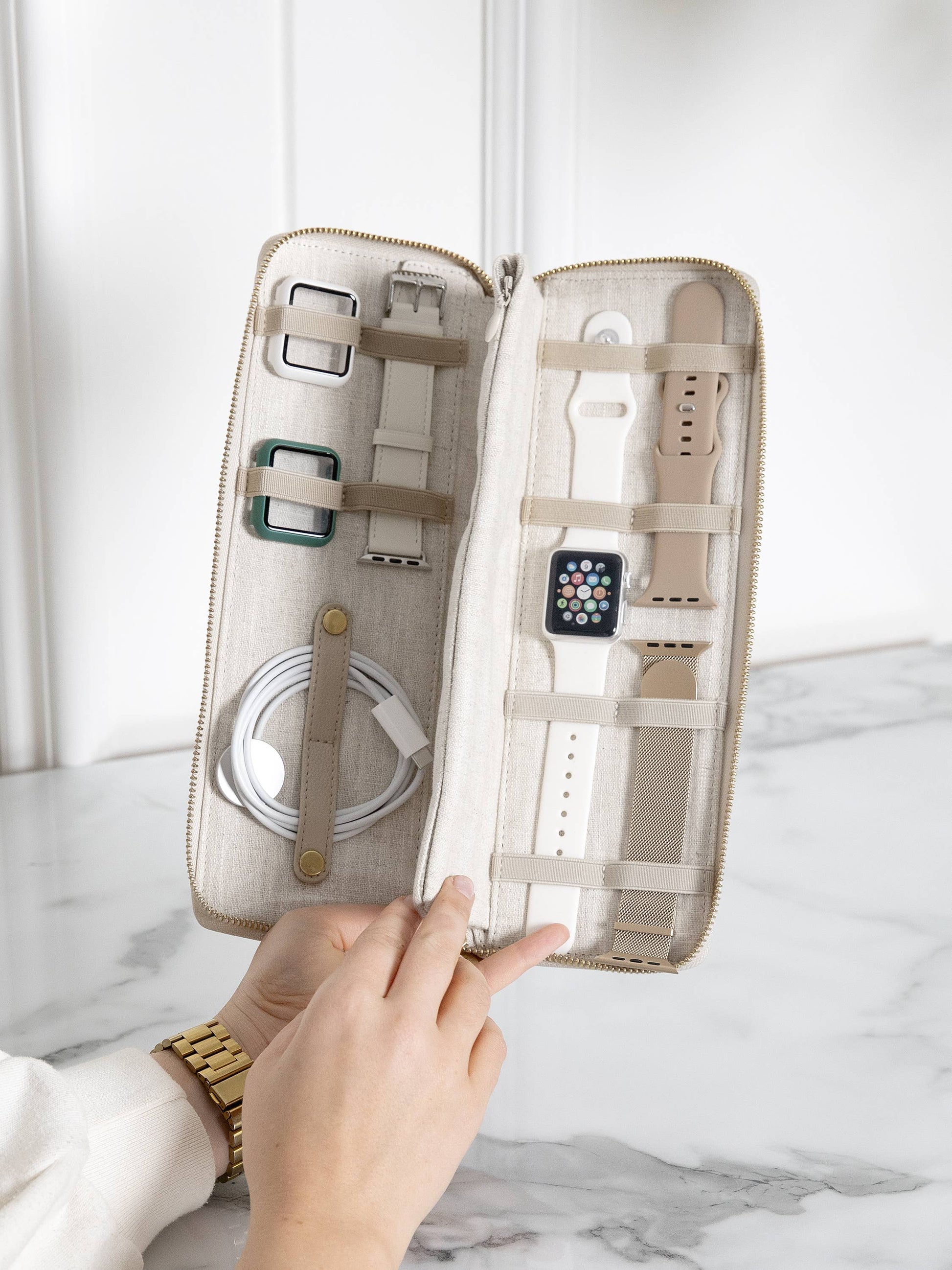 Elasticated loops keep up to 2 watches or straps securely stored, with additional loops for accessories and charging cables.